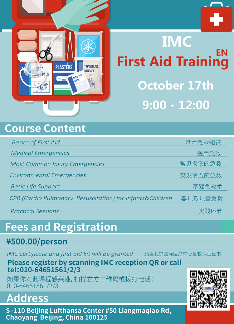 For that reason, two years ago together with IMC International Medical Center (Beijing), we started to organize first aid training. We have trained individual groups and communities, sports clubs, embassies, international schools, and kindergartens. Almost every month, we organize two different types of training in Chinese and English. So far, we have trained staff from schools like Harrow International School, Jack and Jill School, Spring Education Center, Montessori Kindergarten Children’s House, the companies like Huawei and many more. We also organize first aid training for kids where the school age children can learn how to give first aid. Many residental compounds around Beijing have invited us to teach their staff and residents too.